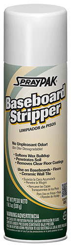 SprayPAK® Baseboard Stripper helps remove the accumulated buildup of soil and darkened wax that occurs on baseboards and on floors along walls and in low-traffic areas. These deposits are emulsified and easily loosened with a clean pad or brush. The inverted tip sprays a long, wide stream that matches most baseboard widths. The new formula, a combination of penetrating cleaners and detergents in an alkaline base, works better with less odor.