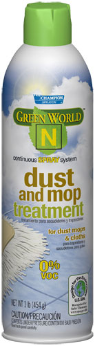 Champion Sprayon® Green World N® Dust and Mop Treatment utilizes environmentally preferable chemistry to treat dust cloths and dust mops for maximum cleaning efficiency. Treated cloths and mops pick up and hold dust without scattering it. Makes regular maintenance faster and easier. Naturally, this dust and mop treatment meets all EPA requirements for Safer Choice labeling. It uses a natural, nonflammable propellant. It is made from biodegradable ingredients, was not tested on animals, contains no harsh chemicals, and leaves no fumes.